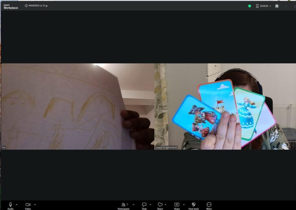 Mokėmės kurti pasakas. Pradžioje pagal mokytojos korteles kūrėme pasaką, ją pasakojome, nupiešėme. Paskui jau Iris nupiešė savo korteles ir mokytoja kūrė pasaką pagal jas.